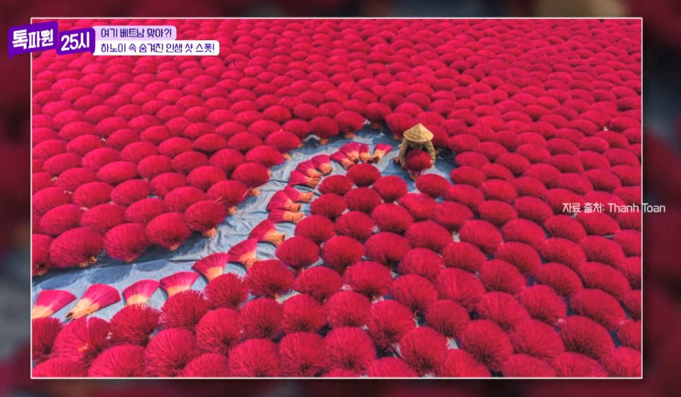 하노이 시내에서 남쪽으로 약 35km 떨어진 꽝푸꺼우 마을은 붉은빛으로 물든 대나무 향을 제작하는 곳으로 유명한 곳입니다. 향을 피우는 건 베트남의 중요한 문화 중 하나로 신에게 감사와 존경을 표하는 영적인 다리 역할을 하는 것 입니다. 꽝푸꺼우 마을의 상징과도 같은 붉은 빛은 향은 색감이 쨍하고 아름다워서 많은 사진 대회에서 수상하였으며 그 이 후 사진 명소로 소문이 나며 전 세계에서 사랑받는 SNS 인생 샷 스폿이라고 합니다.