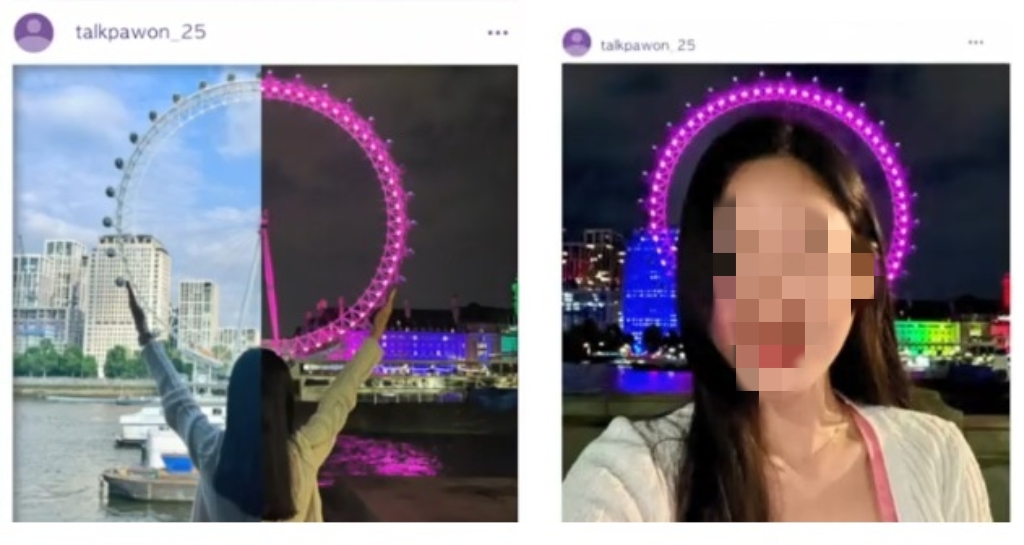 첫번째는 두 손으로 런던아이를 잡고 낮에 촬영 한번, 밤에 다시 한번 같은 포즈로 촬영하여 각각 업로드하지 않고 두 사진을 합치면 런던아이 낮밤 콜라주 인생 샷이 완성됩니다.
