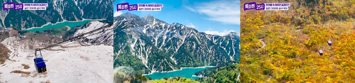 일본의 알프스라 불리는 일본 중부의 고산지대로 다테야마 구로베 알펜 루트는 관광 코스를 이르는 말입니다.