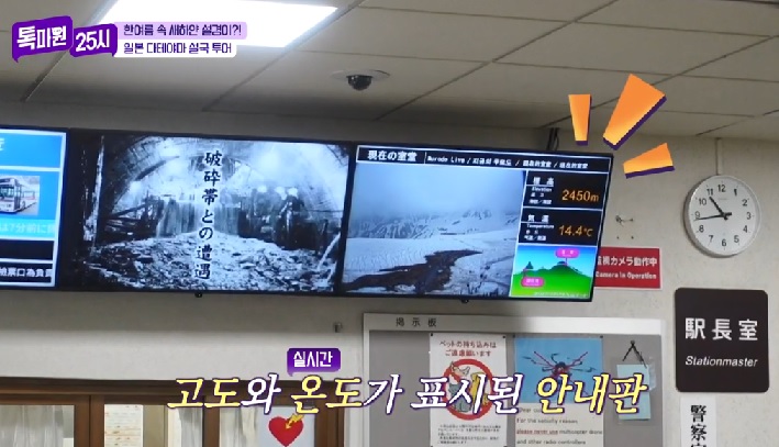 역 안에는 목적지 정상 무로도의 고도와 실시간 온도가 표시된 안내판이 보입니다.