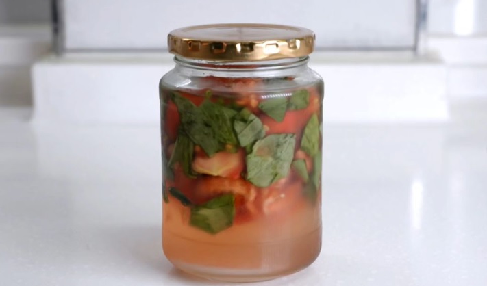 1. 토마토, 설탕 220g, 레몬 1/4개의 즙을 섞고 바질을 찢어서 살살 섞어준다.