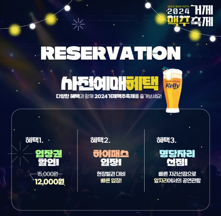 2024 거제 맥주축제는 켈리와 함께 무더운 한여름을 날려버릴 시원한 축제로 인기가수와 함께 할수 있는 맥주 축제 입니다. 사전예매하면 입장권 할인 및 빠른입장 그리고 앞자리에서의 공연관람의 혜택이 있으니 이 기회를 놓치지 마시기 바랍니다.